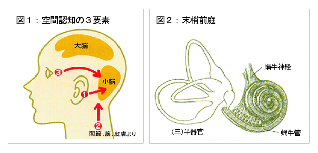 最も重要なのは耳からの情報です。耳の鼓膜の奥に中耳、さらに内耳があります。内耳は音を聞く蝸牛(かぎゅう)と動きや重力を感じる前庭(ぜんてい)から成っています。前庭には動きを感知する3つの半器管があり、(図2) 互いに直交する三次元空間を認識しています。