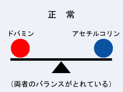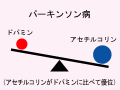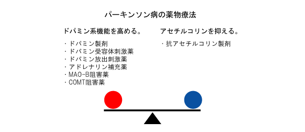 パーキンソン病の治療の第1は、薬による治療です。パーキンソン病はドパミンとアセチルコリンのバランスが崩れた状態となっているため、このバランスを補正することが治療薬の働きです。