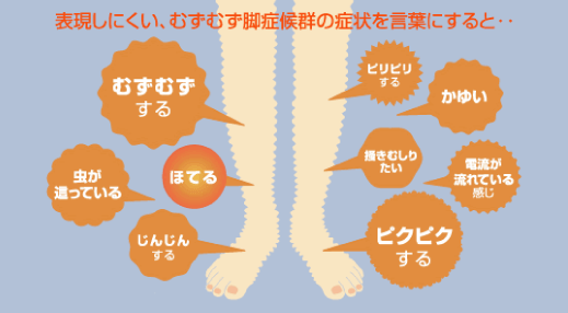 むずむず脚症候群は足の裏やふくらはぎ、太ももなどに不快感が起こり、じっとしていられなくなる病気で、レストレスレッグス症候群(RLS:Restless