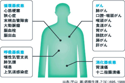 咳やたん、鼻づまり、息切れや疲れやすさが無くなります。身体のだるさが取れ、体力が回復してきます。潰瘍・十二指腸潰瘍の再発率が3分の1になり、心筋梗塞の危険性も半減します。