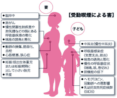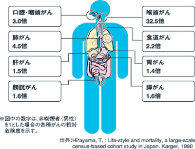間接喫煙もタバコの重大な害です。夫が20本以上吸う妻は、タバコを吸わない夫の妻に比べて肺癌に1.9倍かかりやすいというデーターがあります。これは少しの煙であっても、フィルターを通さないためと考えられています。