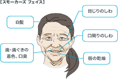 また、タバコを吸っていると皮膚のハリがなくなってきて、目じり・口周りなどのしわが増えます。そのため、実際の年齢よりも老けて見えます。このような喫煙者に特有の顔を「スモーカーズ フェイス」といい、しわに加え、歯や歯ぐきの着色、口臭、白髪、頭髪の脱毛なども伴います。タバコはお肌の大敵なので、禁煙はどんな高級な化粧品よりも美容効果抜群です。
